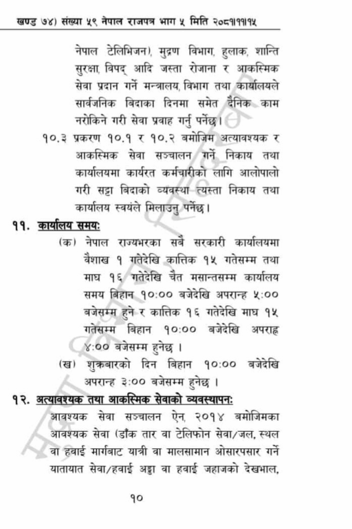 शुक्रबारका दिन भने सरकारी कार्यालय बिहान १० बजेदेखि अपराह्न ३ बजेसम्म मात्र सञ्चालन हुनेछन् ।