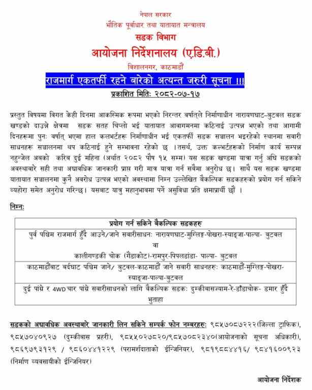 आगामी दिनहरूमा पुनस् वर्षा भएमा हाल कलभर्टहरू निर्माणाधीन भई एकतर्फी सडक सञ्चालन भइरहेको स्थानमा सवारी साधन सञ्चालनमा थप कठिनाइ हुने सम्भावना देखिएको भन्दै निर्देशनालयले कल्भर्टहरूको निर्माण कार्य सम्पन्न नहुन्जेल अबको करिब दुई महिना (२०८२ पौष १५ सम्म) यो सडक खण्डमा यात्रा गर्नुअघि सडकको अवस्थाबारे सही तथा अद्यावधिक जानकारी लिन पनि यात्रुहरुलाई अनुरोध छ।