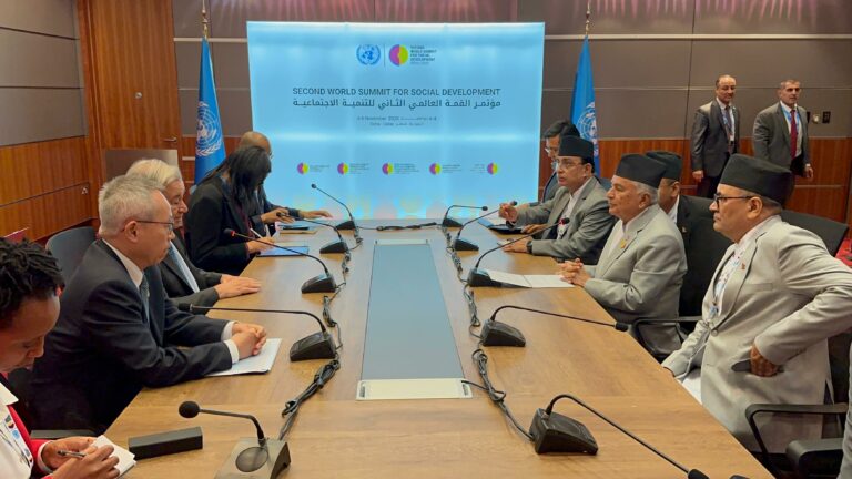 कतारका अमिर शेख तमिम बिन हमद अल थानीको निमन्त्रणामा नेपाली प्रतिनिधिमण्डलको नेतृत्व गर्दै कतारको राजधानी दोहामा मंगलबारदेखि सुरु भएको ‘सामाजिक विकासका लागि दोस्रो विश्व शिखर सम्मेलन’मा सहभागी हुन आएका राष्ट्रपति पौडेल र  संयुक्त राष्ट्रसंघका महासचिव गुटेरेसबीच आज यहाँ शिष्टाचार भेटवार्ता भएको हो ।