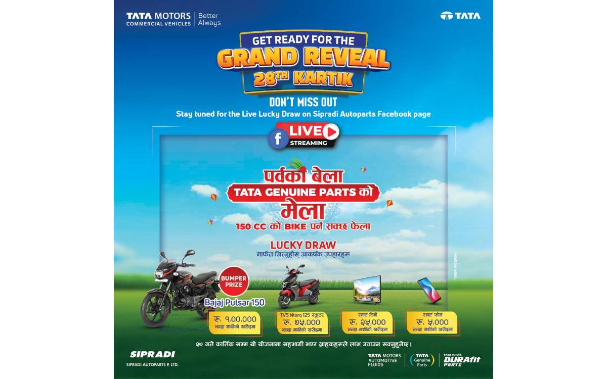 काठमाडौं । सिप्रदी अटोपार्ट्स प्रालिले सञ्चालन गरिरहेको ‘पर्वको बेला टाटा जेन्युइन पार्ट्सको मेला’ योजनाअन्तर्गत ग्राहकहरूले कार्तिक २७ गते (नोभेम्बर १३) सम्म टाटा जेन्युइन पार्ट्स खरिद गरी लक्की ड्रमा सहभागी हुने तथा खरिदकै समयमा रु. १,००० सम्मको क्यासब्याक कुपन प्राप्त गर्ने अवसर पाउने भएका छन् ।