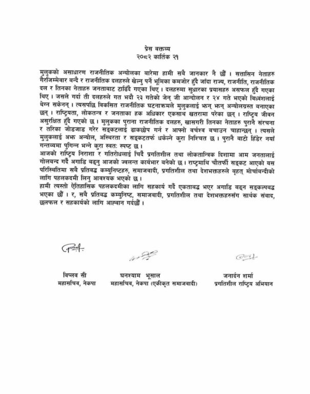 ‘मुलुकका पुराना राजनीतिक दलहरु, खासगरी तिनका नेताहरु पुरानै संरचना र तरिका जोडजाड गरेर संकटलाई ढाकछोप गर्न र आफ्नो वर्चस्व बचाउन चाहान्छन् । त्यसले मुलुकलाई अझ अन्योल, अस्थिरता र संकटतर्फ धकेल्ने कुरा निश्चित छ । पुरानै बाटो हिँडेर नयाँ गन्तव्यमा पुगिन्न भन्ने कुरा स्वतः स्पष्ट छ,’ जारी विज्ञप्तिमा भनिएको छ ।