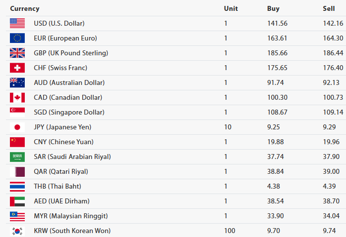राष्ट्र बैंकका अनुसार अमेरिकी डलर एकको खरिददर १४१ रुपैयाँ ५६ पैसा र बिक्रीदर १४२ रुपैयाँ १६ पैसा निर्धारण गरिएको छ । यस्तै, युरोपियन युरो एकको खरिददर १६३ रुपैयाँ ६१ पैसा र बिक्रीदर १६४ रुपैयाँ ३० पैसा, युके पाउण्ड स्ट्रलिङ एकको खरिददर १८५ रुपैयाँ ६६ पैसा र बिक्रीदर १८६ रुपैयाँ ४४ पैसा, स्वीस फ्रयाङ्क एकको खरिददर १७५ रुपैयाँ ६५ पैसा र बिक्रीदर १७६ रुपैयाँ ४० पैसा कायम गरिएको छ ।