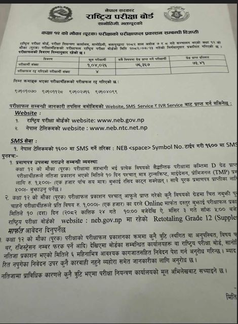 नतिजा हेर्नका लागि नेपाल टेलिकमको १६०० नम्बरमा एसएमएस पठाउन सकिने बोर्डले जनाएको छ ।