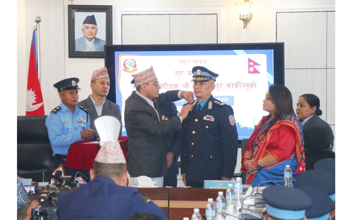 काठमाडौं । नवनियुक्त नेपाल प्रहरीका महानिरीक्षक (आईजीपी) दानबहादुर कार्कीले बिहीबार दर्ज्यानी चिह्न लगाएका छन् । गृह मन्त्रालयमा आयोजित विशेष समारोहका बिच उनलाई गृह सचिव रामेश्वर दंगालले दर्ज्यानी चिह्न लगाइ दिएका हुन् ।