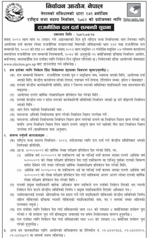 निर्वाचन आयोगले राष्ट्रियसभाका लागि मंसिर १ देखि ७ गतेसम्म र प्रतिनिधिसभाका लागि मंसिर १ देखि १० गतेसम्म दल दर्ता खुला गरेको हो ।