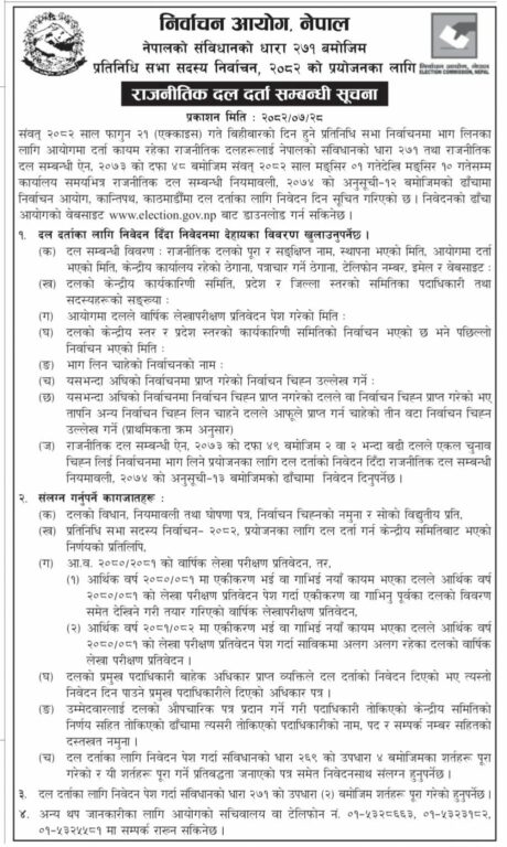 निर्वाचनमा भाग लिन चाहने दलहरूले केन्द्रीय समितिबाट भएको निर्णयको प्रतिलिपि, वार्षिक लेखा परीक्षण प्रतिवेदन तथा अन्य आवश्यक कागजातसहित आयोगमा निवेदन पेस गर्न भनिएको छ ।