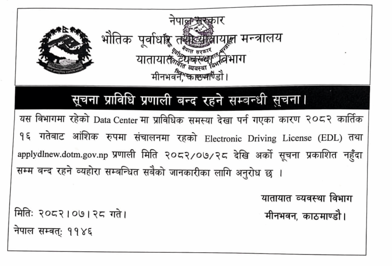 यातायात व्यवस्था विभागले आज एक सूचना जारी गर्दै डेटा सेन्टरमा देखा परेको प्राविधिक समस्याका कारण इलेक्ट्रोनिक ड्राइभिङ लाइसेन्स (EDL) तथा applydlnew.dotm.gov.np मार्फत प्रदान हुँदै आएका सेवाहरू बन्द भएको जानकारी दिएको हो ।