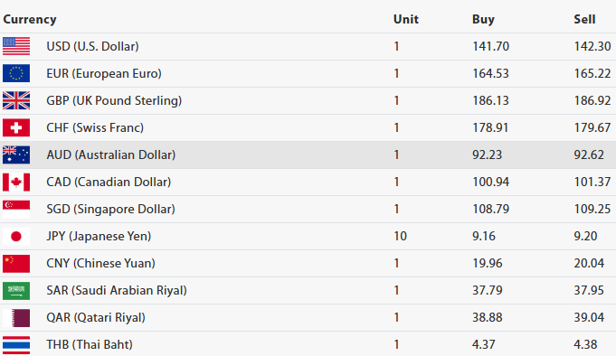 अष्ट्रेलियन डलर एकको खरिददर ९२ रुपैयाँ २३ पैसा र बिक्रीदर ९२ रुपैयाँ ६२ पैसा, क्यानेडियन डलर एकको खरिददर १०० रुपैयाँ ९४ पैसा र बिक्रीदर १०१ रुपैयाँ ३७ पैसा, सिङ्गापुर डलर एकको खरिददर १०८ रुपैयाँ ७९ पैसा र बिक्रीदर १०९ रुपैयाँ २५ पैसा तोकिएको छ ।