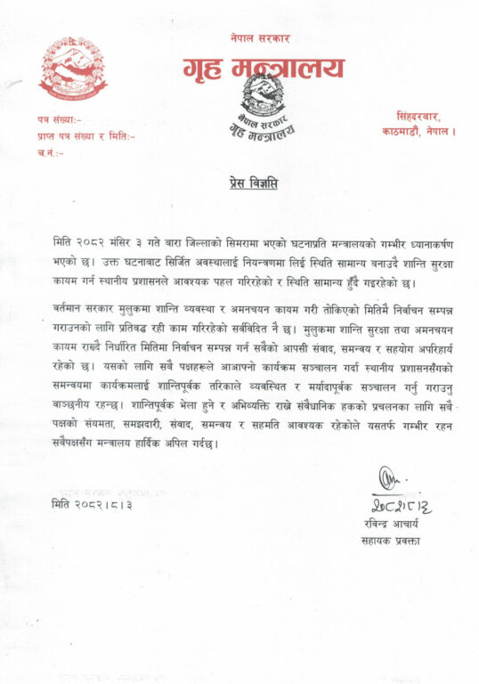 त्यस्तै वर्तमान सरकार मुलुकमा शान्ति व्यवस्था र अमनचयन कायम गरी तोकिएको मितिमा निर्वाचन सम्पन्न गराउन प्रतिबद्ध रहेको समेत दोहोर्याएको छ । साथै मुलुकमा शान्ति कायम गर्दै निर्धारित मितिमा नै निर्वाचन सम्पन्न गर्न सबैको आपसी संवाद, समन्वय र सहयोग अपरिहार्य रहेको जनाएको छ ।