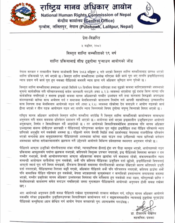 २०६३ मंसिर ५ मा नेपाल सरकार र तत्कालीन नेकपा माओवादीबिच विस्तृत शान्ति सम्झौता भएको १९ वर्ष पुगेको छ । तर सम्झौताअनुसार ६० दिनभित्र बेपत्ता पारिएका तथा युद्धमा मारिएका व्यक्तिबारे विवरण सार्वजनिक गर्ने प्रतिबद्धता आजसम्म पूरा हुन नसकेको आयोगले याद गराएको छ ।