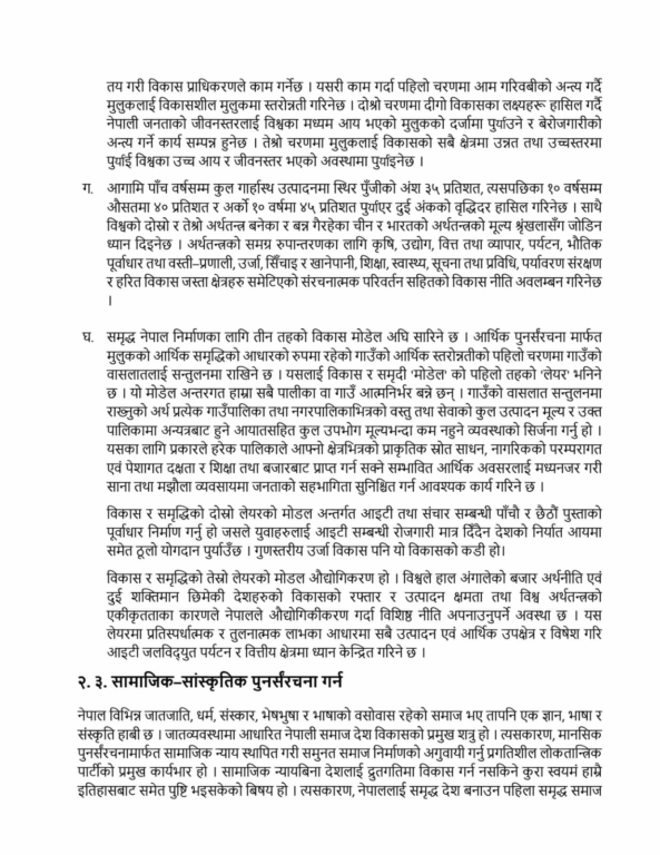 समृद्ध नेपाल निर्माणका लागि तीन तहको विकास मोडेल अघि सारिनेछ । आर्थिक पुनर्संरचनामार्फत् मुलुकको आर्थिक समृद्धिको आधारको रुपमा रहेको गाउँको आर्थिक स्तरोन्नतीको पहिलो चरणमा गाउँको वासलातलाई सन्तुलनमा राखिने छ । यसलाई विकास र समृद्धि ‘मोडेल’ को पहिलो तहको ‘लेयर’ भनिनेछ । यो मोडेल अन्तर्गत हाम्रा सबै पालिका वा गाउँ आत्मनिर्भर बन्नेछन् । गाउँको वासलात सन्तुलनमा राख्नुको अर्थ प्रत्येक गाउँपालिका तथा नगरपालिकाभित्रको वस्तु तथा सेवाको कुल उत्पादन मूल्य र उक्त पालिकामा अन्यत्रबाट हुने आयातसहित कुल उपभोग मूल्यभन्दा मकम नहुने व्यवस्थको सिर्जना गर्नु हो । यसका प्रकारले हरेक ािलकाले आफ्नो क्षेत्रभित्रको प्राकृतिक स्रोतसाधन, नागरिकको परम्परागत एवं पेशागत दक्षता र शिक्षा तथा बजारबाट प्राप्त गर्न सक्ने सम्भावित आर्थिक अवसरलाई मध्यनजर गरी साना तथा मmौला व्यवसायमा जनताको सहभागिता सुनिश्चित गर्न आवश्यक कार्य गरिनेछ । विकास र समृद्धिको दोस्रो लेयरको मोडल अन्तर्गत आईटी तथा संचारसम्बन्धी पाँचौ र छैठौँ पुस्ताको पूर्वाधार निर्माण गर्नु हो, जसले युवाहरुलाई आइटीसम्बन्धी रोजगारी मात्र दिँदैन देशको निर्यात आयमा समेत ठूलो योगदान पुर्याउँछ । गुणस्तरीय उर्जा विकास पनि यो विकासको कडी हो ।