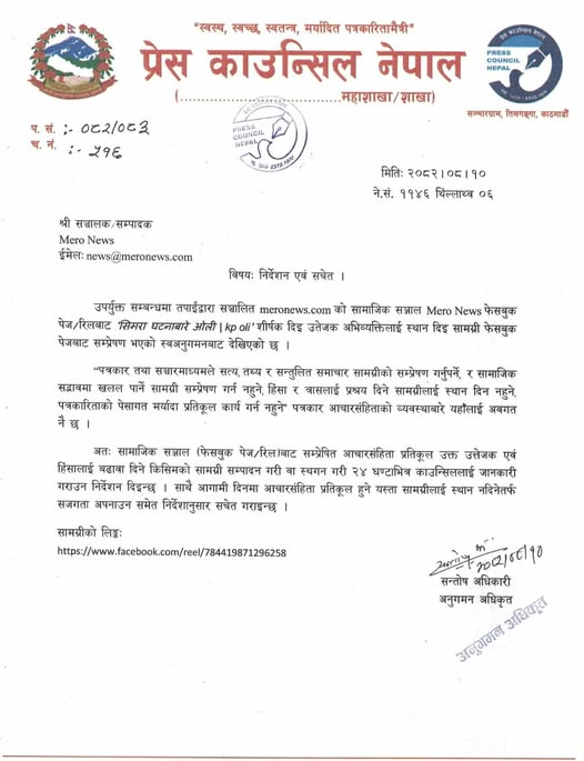 यस्तो छ प्रेस काउन्सिलको पत्र