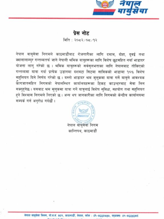 ‘नेपाल वायुसेवा निगमले काठमाडौंबाट रोजगारीका लागि दमाम, दोहा, दुवई तथा क्वालालाम्पुर गन्तव्यतर्फ जाने नेपाली श्रमिक यात्रुहरुका लागि विशेष छुटसहित नयाँ भाडादर योजना लागू गरेको छ । श्रमिक यात्रुहरुको सर्वसुलभताका लागि नेपालबाट तोकिएको गन्तव्यमा यात्रा गर्दा प्रत्येक उडानमा १० वटा सिटमा साविकको भाडामा १० प्रतिशत विशेष सहुलियत दिने निर्णय गरेको छ,’ नेपाल एयरलाइन्सले भनेको छ ।