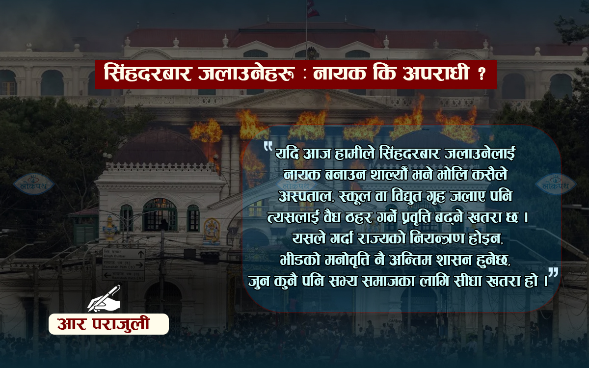 यदि आज हामीले सिंहदरबार जलाउनेलाई नायक बनाउन थाल्यौँ भने भोलि कसैले अस्पताल, स्कुल वा विद्युत् गृह जलाएपनि त्यसलाई वैध ठहर गर्ने प्रवृत्ति बढ्ने खतरा छ । यसले गर्दा राज्यको नियन्त्रण होइन, भीडको मनोवृत्ति नै अन्तिम शासन हुनेछ, जुन कुनै पनि सभ्य समाजका लागि सीधा खतरा हो ।