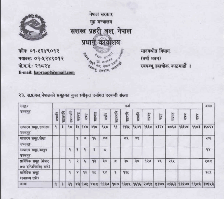 साधारण समूह (साधारण उपसमूह), साधारण समूह (लेखा उपसमूह), साधारण समूह (कानुन उपसमूह) प्राविधिक समूह (सञ्चार तथा इन्जिनियरिङ) र प्राविधिक समूह (स्वास्थ्यतर्फ) गरी कुल स्वीकृत दर्जागत दरबन्दी संख्या ३७ हजार १ सय ५३ कायम भएको हो ।