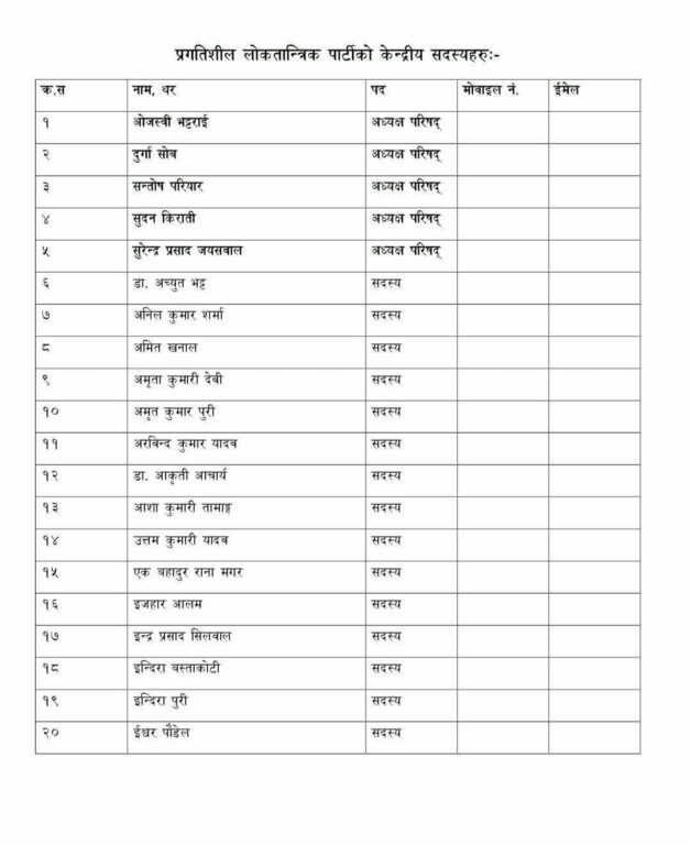 काठमाडौं । एक साताअघि घोषणा गरिएको प्रगतिशील लोकतान्त्रिक पार्टी (प्रलोपा)ले १५१ सदस्यीय केन्द्रीय कमिटी घोषणा गरेको छ । मंसिर ७ गते घोषित प्रगतिशील लोकतान्त्रिक पार्टीको आज सोमबार केन्द्रीय कमिटी घोषणा गरिएको हो ।