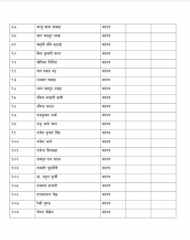 केन्द्रीय कमिटीको अध्यक्ष परिषदमा ओजस्वी भट्टराई, दुर्गा सोव, सन्तोष परियार, सुदन किराती र सुरेन्द्रप्रसाद जयसवालको नाम रहेको छ । बाँकी सबैलाई केन्द्रीय कमिटी सदस्य तोकिएको हो । सो पार्टीको संरक्षकसमेत रहेका पूर्वमन्त्री जनार्दन शर्माको नाम केन्द्रीय कमिटी सदस्यमा पनि राखिएको छ ।
