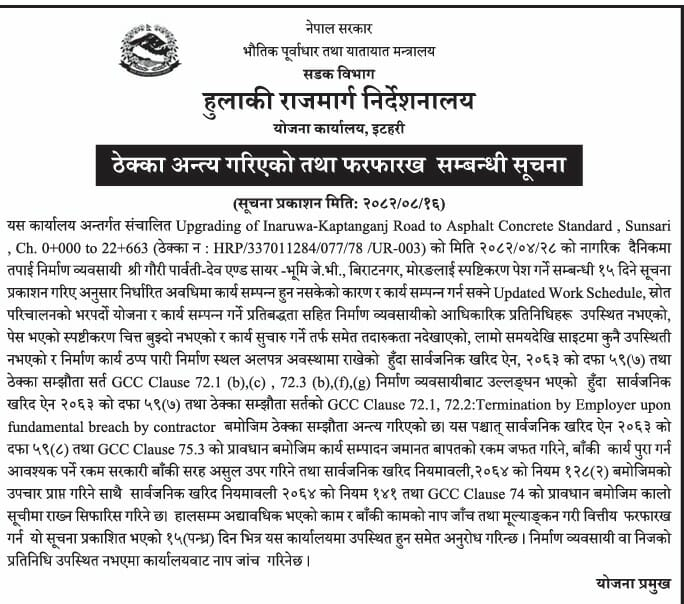 यसअघि साउनमा ‘ठेक्का किन नतोड्ने ?’ भनी १५ दिने स्पष्टीकरण मागिएको थियो । निर्माण कम्पनीको स्पष्टीकरण सन्तोषजनक नभएपछि सार्वजनिक खरिद ऐनअनुसार ठेक्का समाप्त गरिएको हो ।