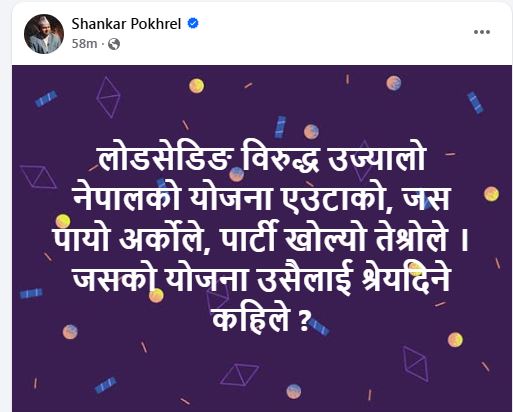 उनले फेसबुकमा लेखेका छन्, ‘लोडसेडिङविरुद्ध ‘उज्यालो नेपाल’को योजना बनाउने एउटै, जस पायो अर्कोले, पार्टी खोल्यो तेस्रोले । जसको योजना, उसैले श्रेय पाउने कहिले हो ?’