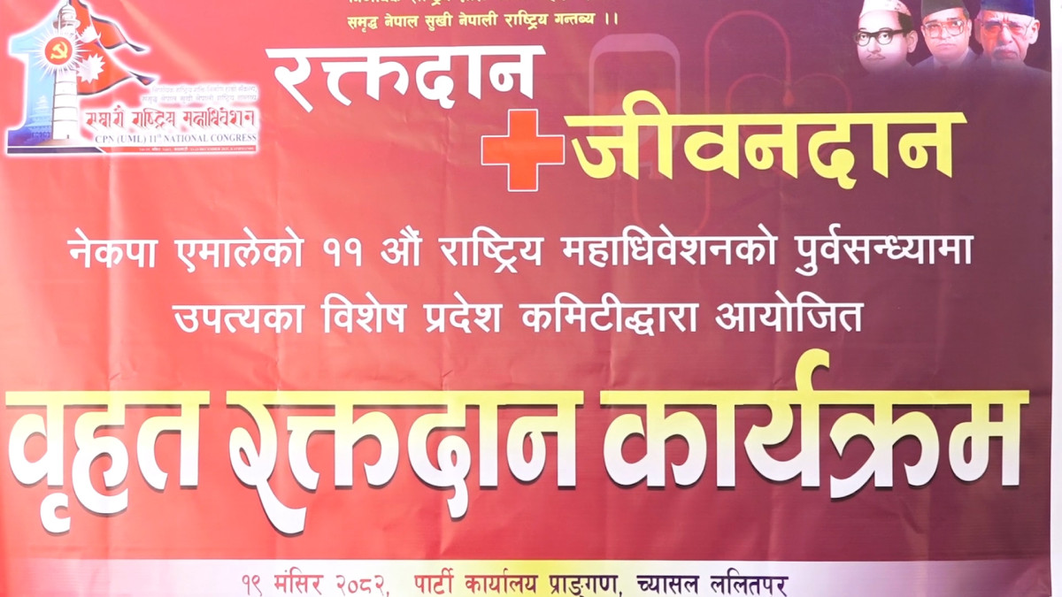 काठमाडौं । पार्टीको ११औँ महाधिवेशनको पूर्वसन्ध्यामा नेकपा (एमाले) ले रक्तदान कार्यक्रम सञ्चालन गरेको छ ।