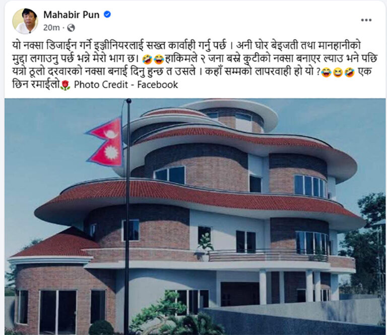 उनले हाकिमले दुई जना बस्ने कुटीको नक्सा बनाउनु भन्दा इन्जिनियरले ‘यत्रो ठूलो दरबारको नक्सा’ बनाइदिएको भन्दै कटाक्ष गरेका हुन् । उनले यसलाई ‘कहाँसम्मको लापरबाही’ भन्दै प्रश्न गरेका छन् ।