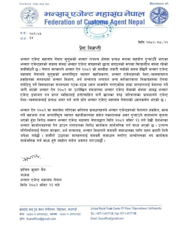 नयाँ लागू गरिएको भन्सार ऐन २०८२ का प्रावधान एजेन्टहरूको पेसागत हकहितविरुद्ध रहेको भन्दै आज देशभर पेन-डाउन विरोध गर्न लागेको हो ।
