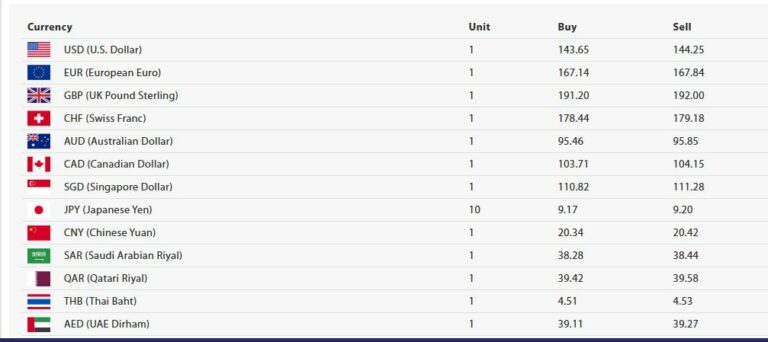 काठमाडौं । नेपाल राष्ट्र बैंकले आजका लागि विदेशी मुद्राको विनिमयदर निर्धारण गरेको छ । राष्ट्र बैंकका अनुसार अमेरिकी डलर एकको खरिददर १४३ रुपैयाँ ६५ पैसा र बिक्रीदर १४४ रुपैयाँ २५ पैसा कायम भएको छ ।