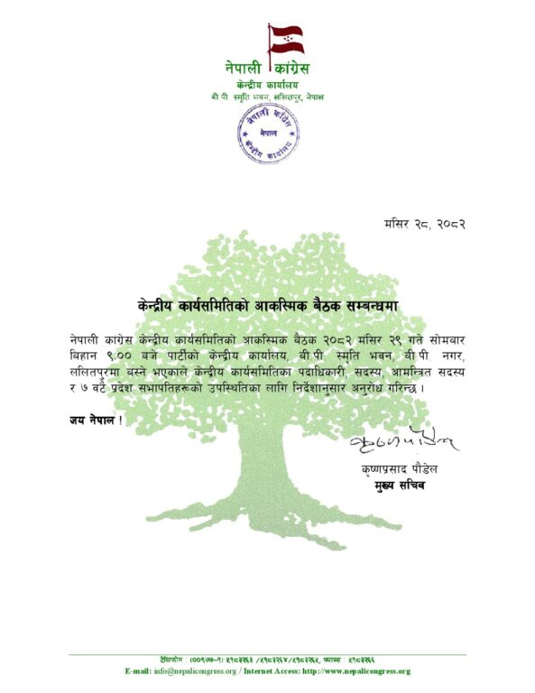 काठमाडौं। नेपाली कांग्रेसले केन्द्रीय कार्यसमितिको आकस्मिक बैठक बोलाएको छ । सानेपास्थित पार्टी मुख्यालयमा भोलि बिहान ९ बजेका लागि बैठक बोलाएको हो ।