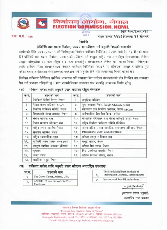 फागुन २१ निर्वाचन : पर्यवेक्षणका लागि ३१ संस्थाले पाए अनुमति [सूचीसहित]