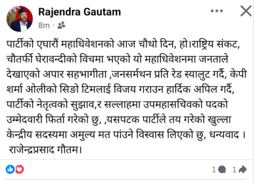 गौतमले सामाजिक सञ्जाल फेसबुकमार्फत उम्मेदवारी फिर्ता लिएको जानकारी दिएका हुन् । उनले पार्टी नेतृत्वको सल्लाह र सुझाव अनुसार उपमहासचिव पदको उम्मेदवारी फिर्ता गरेको बताएका छन् ।