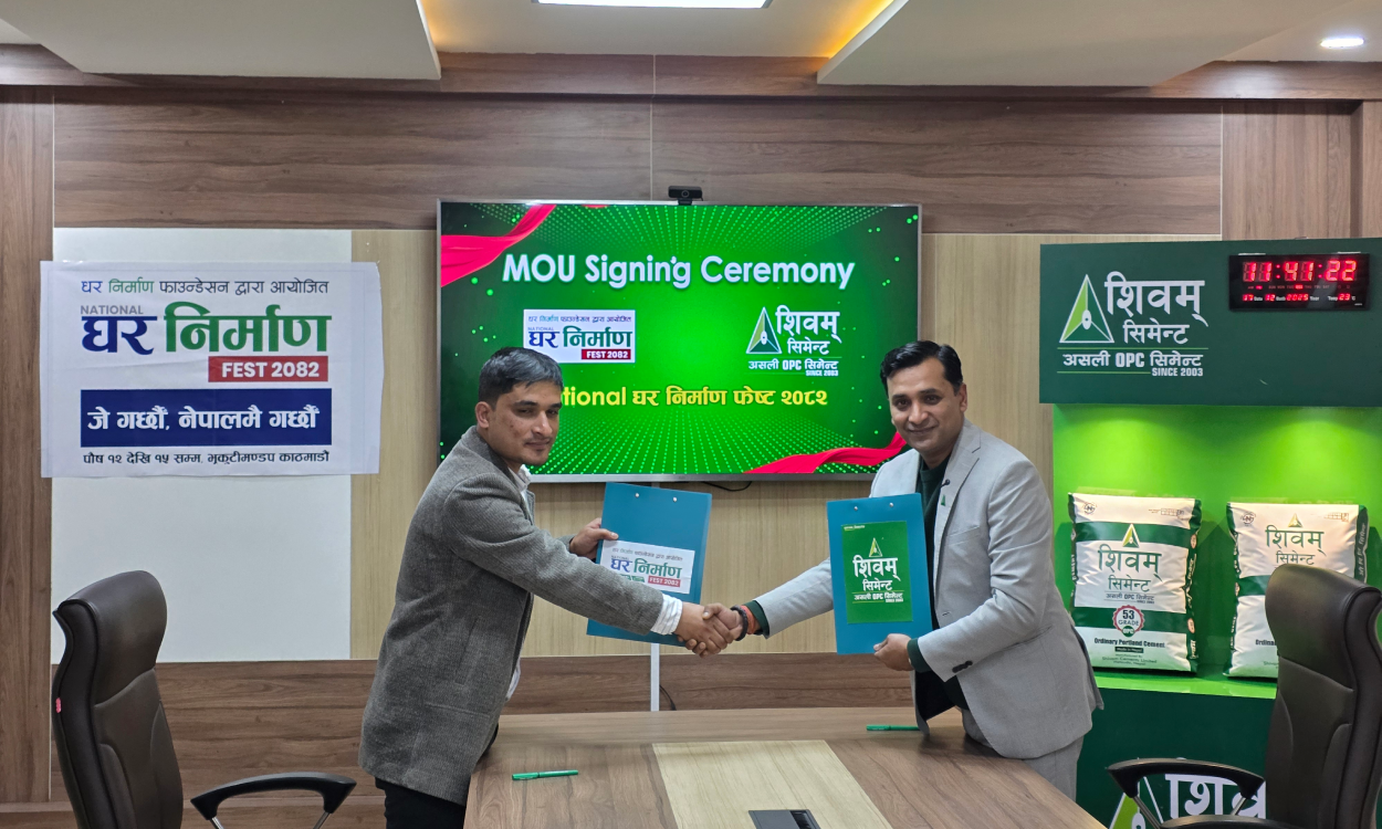 सम्झौताअनुसार स्कील सेवा प्रालिद्वारा आयोजना हुने नेशनल घर निर्माण फेस्ट–२०८२ मा शिवम् सिमेन्ट लिमिटेड प्रायोजको रूपमा आबद्ध भएको हो । घर निर्माण, परामर्श तथा प्रविधिमुखी यो राष्ट्रिय स्तरको प्रदर्शनी २०८२ पुस १२ गतेदेखि १५ गतेसम्म काठमाडौंको भृकुटीमण्डपमा आयोजना हुँदैछ । प्रदर्शनी सर्वसाधारणका लागि निःशुल्क प्रवेश रहने आयोजकले जनाएको छ ।