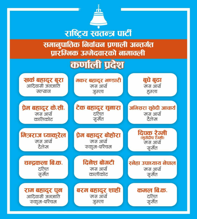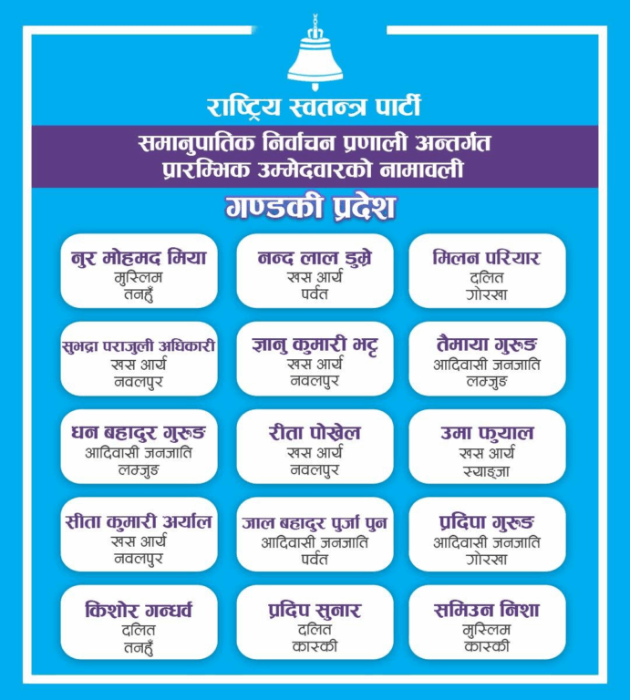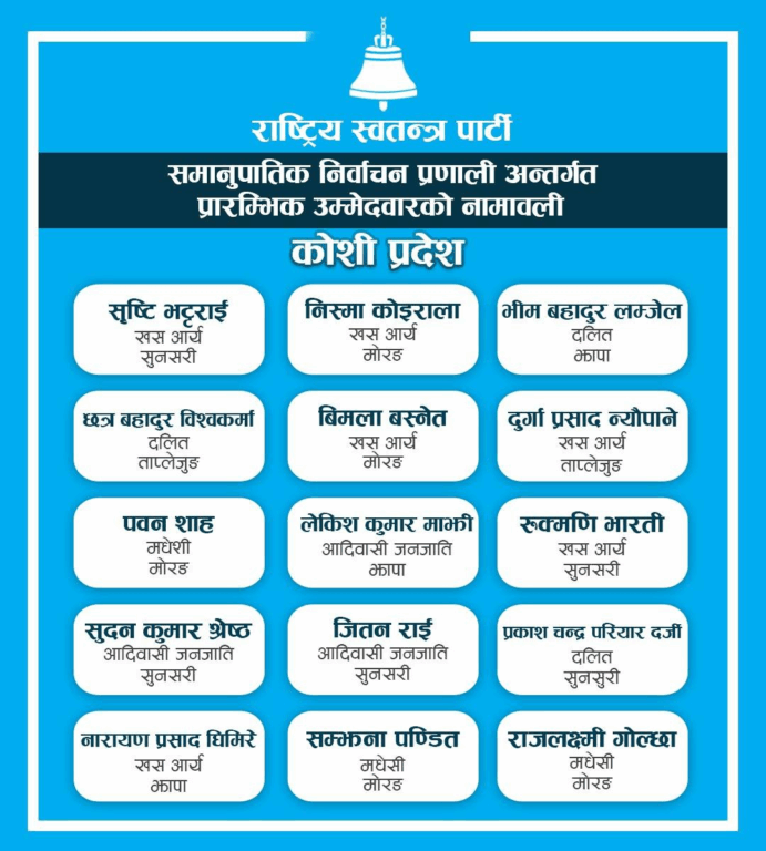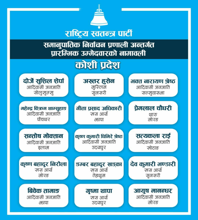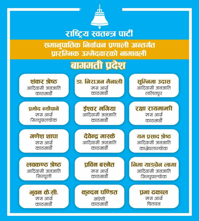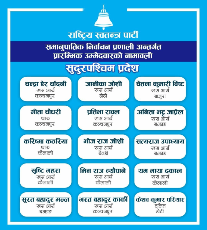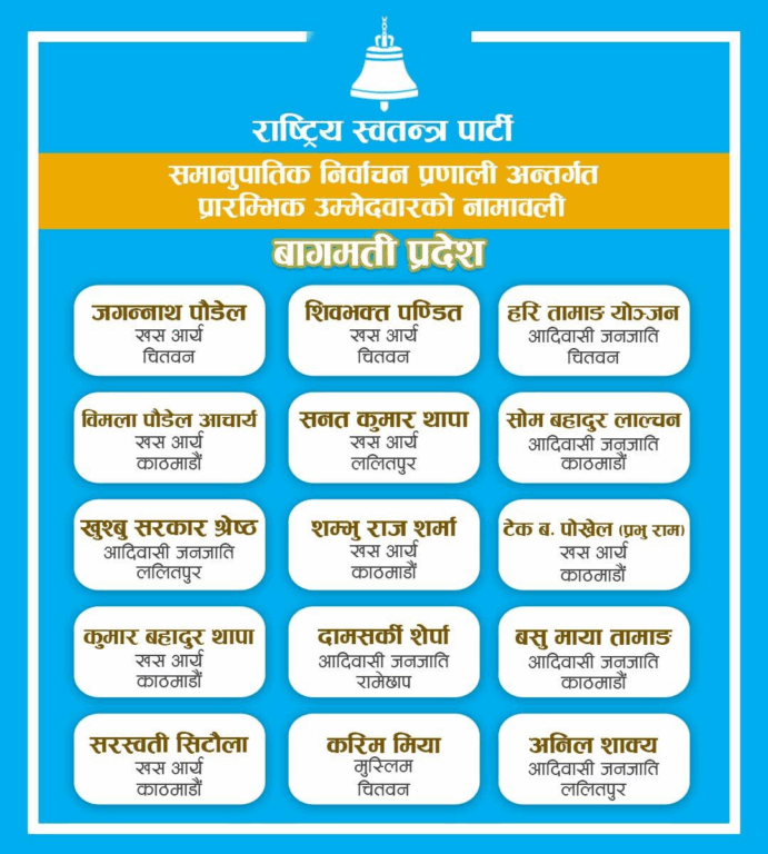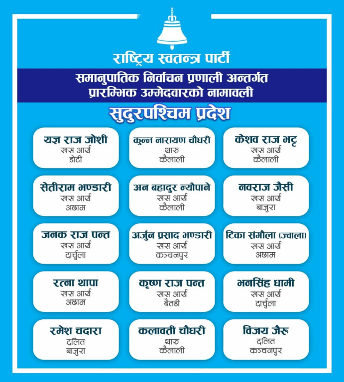 काठमाडौं । राष्ट्रिय स्वतन्त्र पार्टी (रास्वपा) ले समानुपातिक निर्वाचन प्रणाली अन्तर्गत सातै प्रदेशका लागि आन्तरिक उम्मेदवार छनोट प्रक्रियामा परेका प्रारम्भिक उम्मेदवारको नामावली सार्वजनिक गरेको छ ।