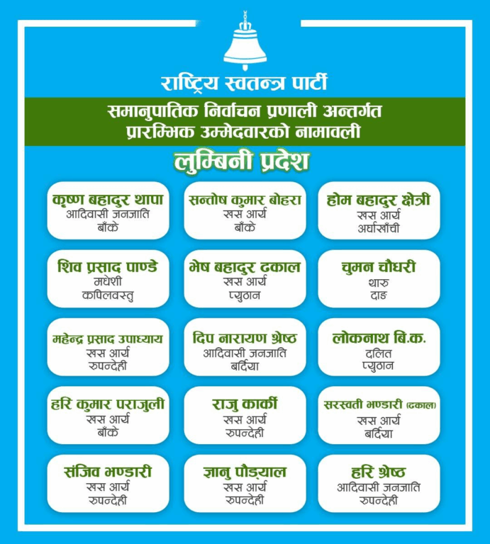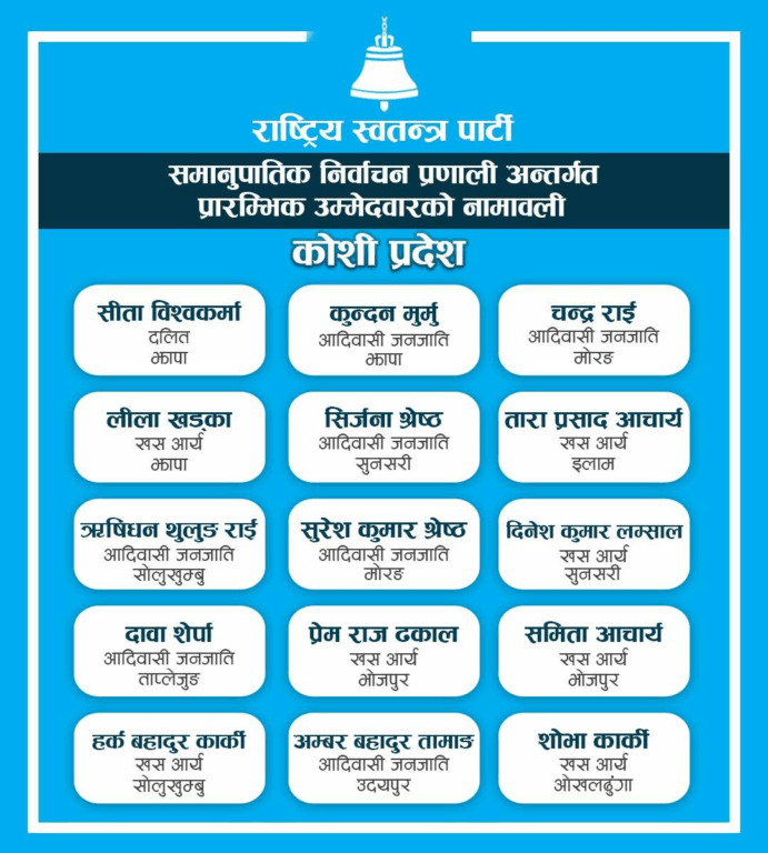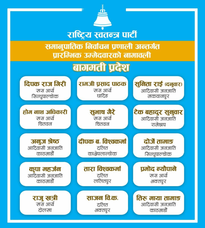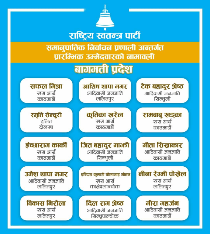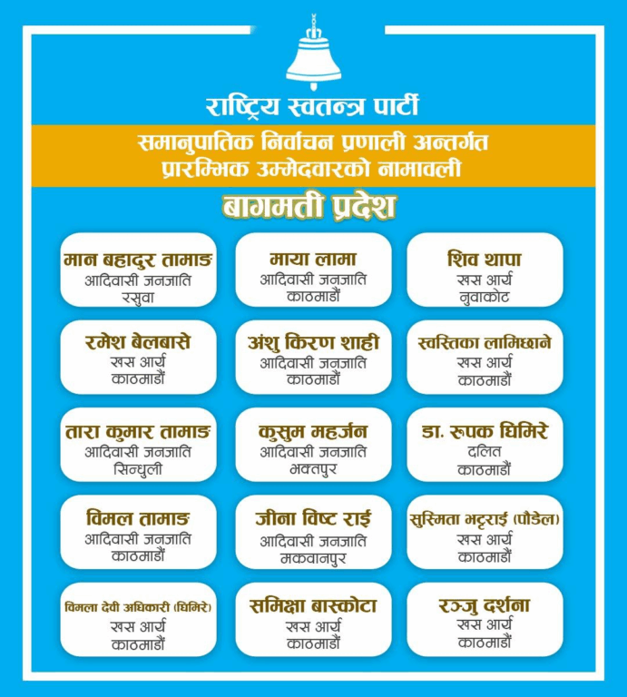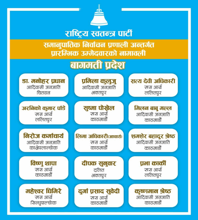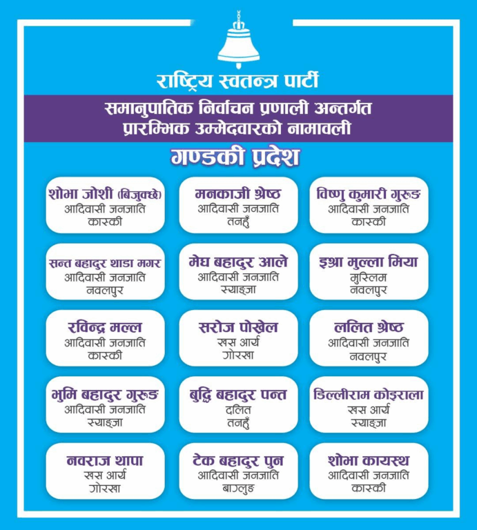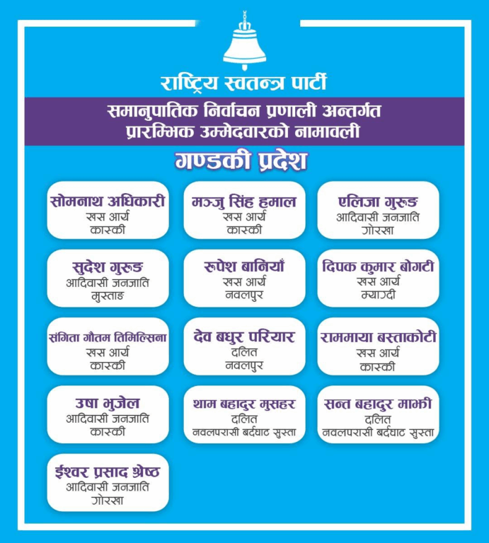 काठमाडौं । राष्ट्रिय स्वतन्त्र पार्टी (रास्वपा) ले समानुपातिक निर्वाचन प्रणाली अन्तर्गत सातै प्रदेशका लागि आन्तरिक उम्मेदवार छनोट प्रक्रियामा परेका प्रारम्भिक उम्मेदवारको नामावली सार्वजनिक गरेको छ ।
