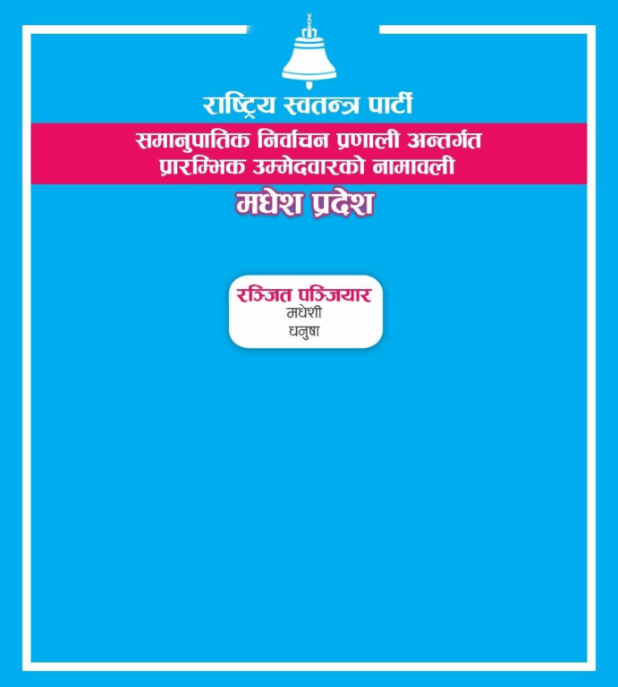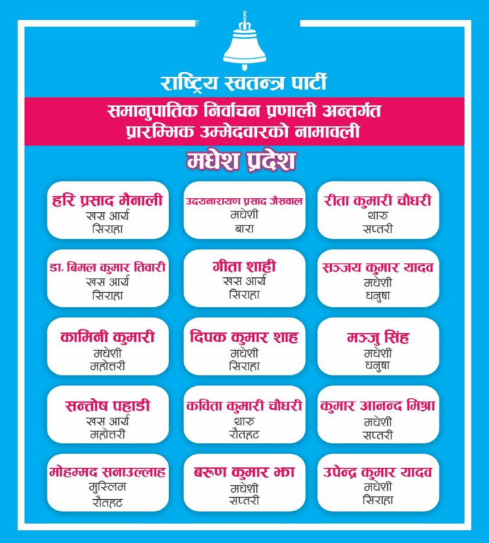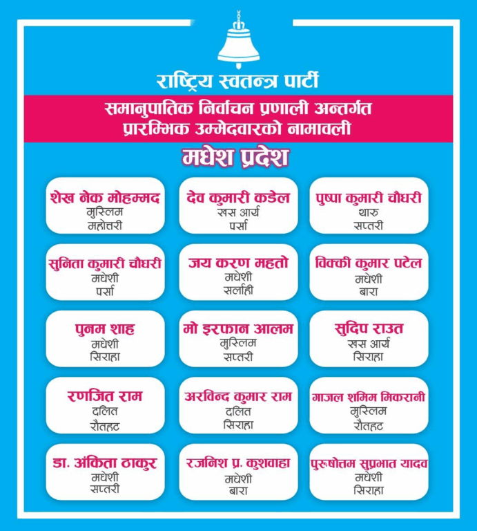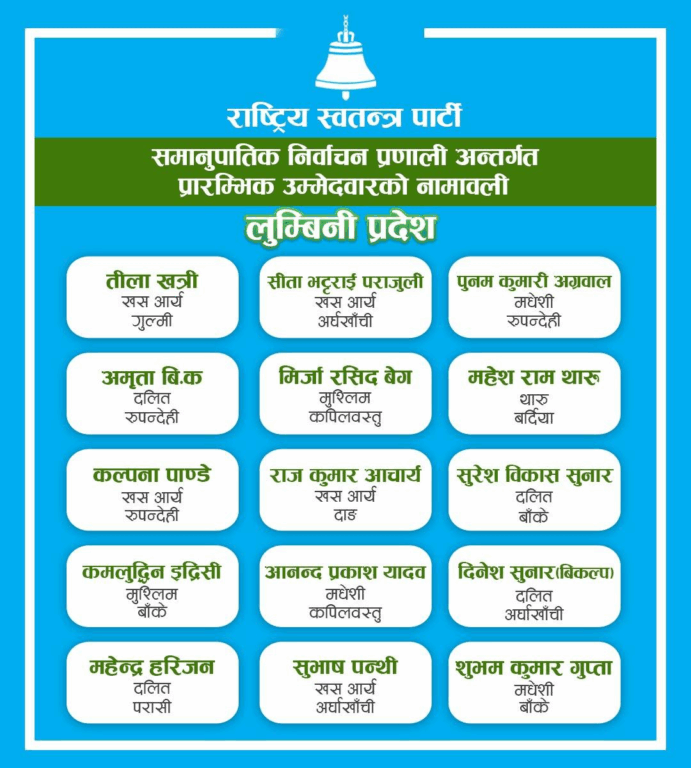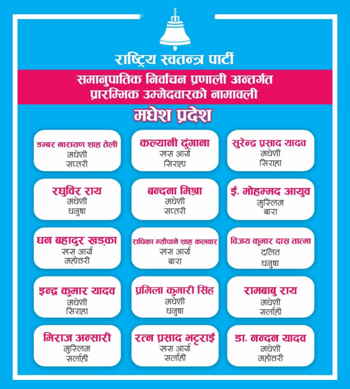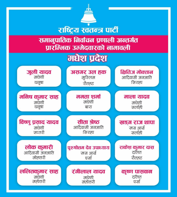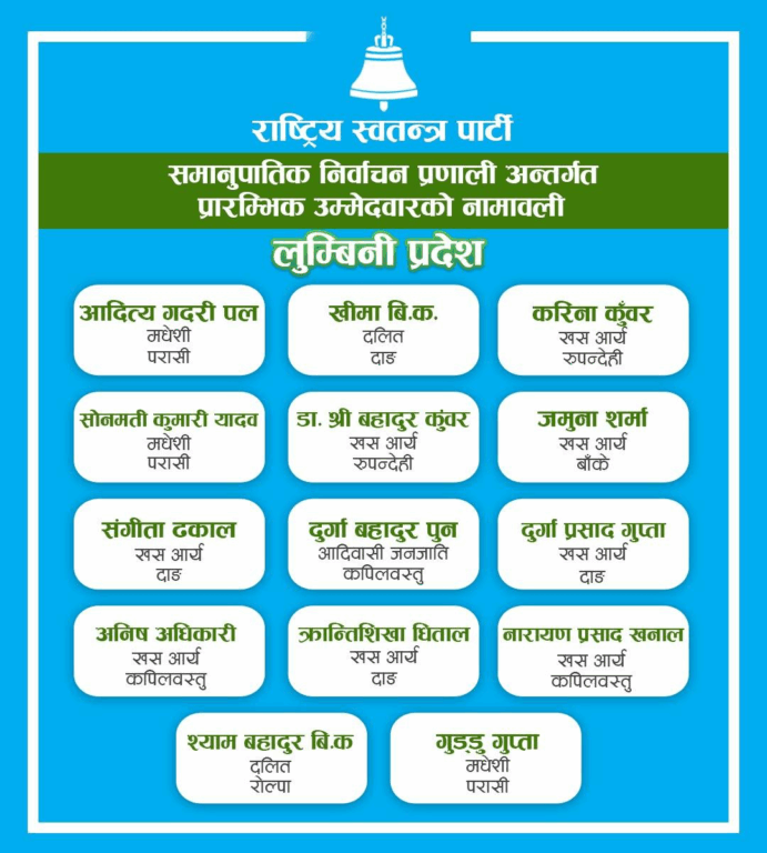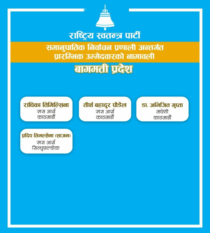 काठमाडौं । राष्ट्रिय स्वतन्त्र पार्टी (रास्वपा) ले समानुपातिक निर्वाचन प्रणाली अन्तर्गत सातै प्रदेशका लागि आन्तरिक उम्मेदवार छनोट प्रक्रियामा परेका प्रारम्भिक उम्मेदवारको नामावली सार्वजनिक गरेको छ ।