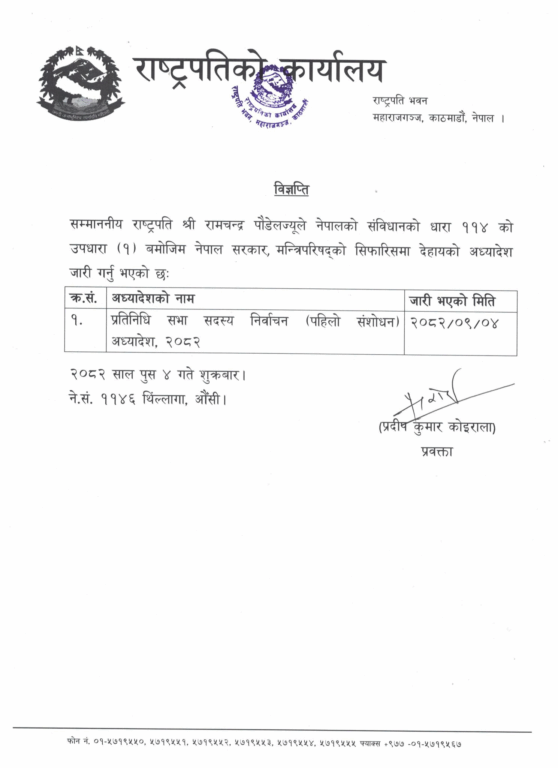 शुक्रबार राष्ट्रपति पौडेलले संविधानको धारा ११४ को उपधारा १ बमोजिम अध्यादेश जारी गरेको राष्ट्रपति कार्यालयले जनाएको छ ।