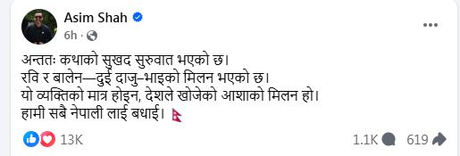 मंगलबार सामाजिक सञ्जाल फेसबुकमार्फत प्रतिक्रिया दिँदै शाहले लेखेका छन्, ‘अन्ततः कथाको सुखद सुरुवात भएको छ । रवि र बालेन दुई दाजु भाइको मिलन भएको छ । यो व्यक्तिको मात्र होइन, देशले खोजेको आशाको मिलन हो । हामी सबै नेपालीलाई बधाई ।’