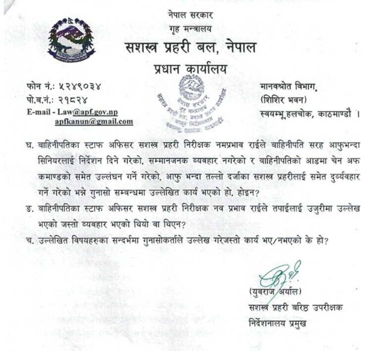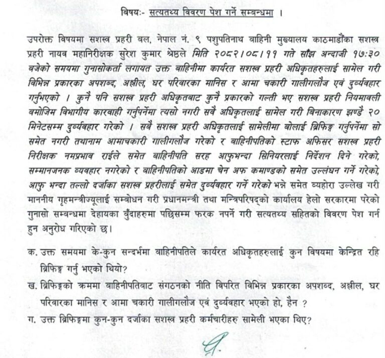 मुख्यालयले के, कुन विषयमा केन्द्रित रही बाहिनीपति श्रेष्ठले कार्यरत अधिकृतहरूलाई ब्रिफिङ गरेको हो ? ब्रिफिङका सम्बन्धमा बाहिनीपतिबाट संगठनको नीतिविपरीत विभिन्न प्रकारका अपशब्द, अश्लील, घर परिवारका मानिस र आमाचकारी गालीगलौज एवं दुर्व्यवहार भएको हो ? ब्रिफिङमा कुन कुन दर्जाका सशस्त्र प्रहरी कर्मचारी सामेली थिए ? भन्नेसहित ६ बुँदे प्रश्न गरेको छ ।