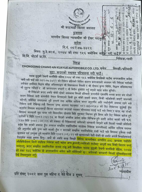 ‘… यी निवेदकको करार अवधि बाँकी रहेको अवस्थामा विपक्षी प्रतिवादी कम्पनीले एकतर्फी रूपमा करार भङ्ग गरेको कारण निवेदक वादी कम्पनीले नेपाल भित्र्याएको बिक्री हुन बाँकी सवारी साधन, बिक्री भइसकेको सवारी साधनको वारेन्टी, सर्भिसिङ लगायतका थुप्रै लगानी तथा आर्थिक दायित्व बापत अपूरणीय क्षति बेहोर्नुपर्ने अवस्था रहने भन्ने निवेदन दाबी देखिन्छ । यसै विषयमा उच्च अदालत पाटनबाट ०८२-WO-०१५७ को रिट निवेदनमा सुनुवाइ हुँदा करारीय विषयमा काठमाडौं जिल्ला अदालतमा करारको यथावत् परिपालना गराई पाऊँ भन्ने विषय र करार भङ्ग गरेको विषयमा जालसाजी मुद्दा दायर गरी विचाराधीन रहेकोले सोही मुद्दाबाट निरूपण हुने विषय भनी रिट निवेदन खारेज हुने ठहरेको र मिति २०८२। ०४।१५ मा दिएको अन्तरिम आदेश समेत निष्क्रिय हुने ठहरी आदेश भएको भनी च.नं. २३७ मिति २०८२।०८।२१ को पत्रबाट यी निवेदकलाई आदेशको जानकारी दिएको भनी दिएको पत्रको प्रतिलिपि समेत पेस भएको अवस्था हुँदा तत्काल सम्झौता यथास्थितिमा नराखेमा निवेदक कम्पनीलाई आर्थिक दायित्व यथावत् रही अपूरणीय क्षति पुग्न जाने भएको हुँदा र करारको सम्झौता यथास्थितिमा राखी पाउँ भन्ने विषयमा दुवै पक्ष राखी छलफल गर्न उपयुक्त हुने भएकोले मिति २०८२।०९।२२ गते छलफलको पेशी तोकी सो अवधि अगावै विपक्षीहरूलाई रितपूर्वक म्याद सूचना दिनू । साथै सो अवधिसम्म विपक्षी चिनिया कम्पनीबाट उत्पादित केवाइसी ब्रान्डका गाडीसँग स्पेशिफिकेसन मिल्ने गाडीहरू निवेदक वादी बाहेक अन्य कम्पनी/व्यक्तिको नाउँबाट आपूर्ति तथा बिक्री वितरण नगर्नू नगराउनू, करार सम्झौता यथास्थितिमा कायम राख्नु भनी विपक्षीहरू नाममा मुलुकी देवानी कार्यविधि संहिता, २०७४ को दफा १५६ बमोजिम यो अन्तरकालीन आदेश जारी गरिदिएको छ ।’