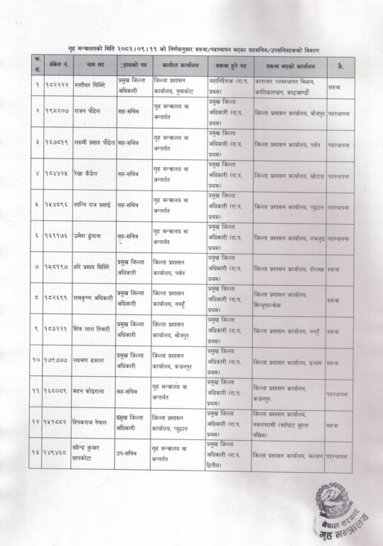 त्यसैगरी हाल गृहमन्त्रालयमा कार्यरत रहेका सहसचिव राजन पौडेललाई जिल्ला प्रशासन कार्यालय भोजपुरमा पदस्थापना गरिएको छ । यसैगरी हाल भोजपुरमा कार्यरत शिवलाल तिवारीलाई जिल्ला प्रशासन कार्यालय तनहुँमा सरुवा गरिएको छ । भने तनहुँमा कार्यरत सीडीओ रामकुष्ण अधिकारीलाई जिल्ला प्रशासन कार्यालय सिन्धुपाल्चोकमा सरुवा गरिएको गृहमन्त्रालयले जनाएको छ ।