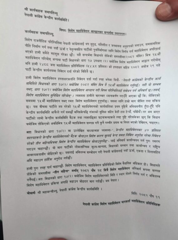 ‘हामी पुनः स्पष्ट पार्न चाहान्छौँ– विशेष महाविधेशन, महाविधेशन प्रतिनिधिको विशेष वैधानिक अधिकार हो । विधानले तोकेको समयसीमा ‘‘तीन महिना’’ अर्थात् २०८२ पौष २८ भित्रै विशेष महाविधेशन अनिवार्य रुपमा सम्पन्न गर्नैपर्छ । अतः विधानको धारा १७(२) बमोजिम विशेष महाधिवेशनको मिति र स्थान तोक्ने निर्णय गर्न र अबिलम्ब विशेष महाधिवेशन प्रक्रिया अगाडी बढाउन जोडदार माग गर्दछौँ,’ ज्ञापन पत्रमा भनिएको छ ।