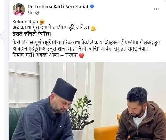काठमाडौं । राष्ट्रिय स्वतन्त्र पार्टी (रास्वपा) की नेतृ डा.तोसिमा कार्कीले अब मुलुक नयाँ दिशातर्फ अघि बढ्ने दाबी गरेकी छन् ।