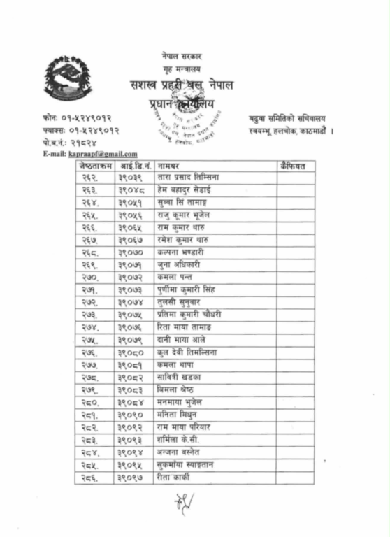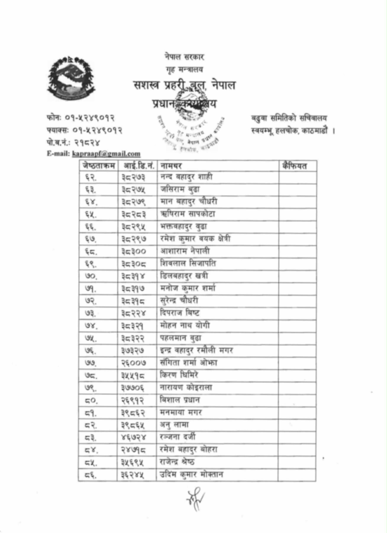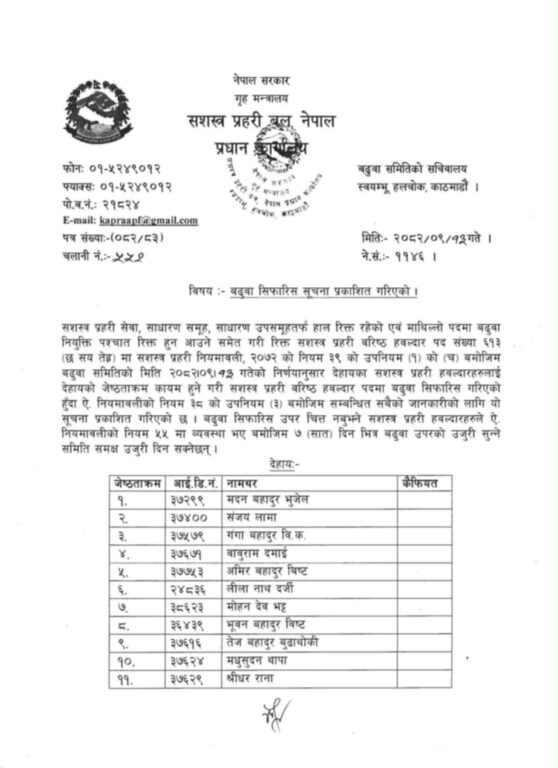 काठमाडौं । एकैपटक सशस्त्र प्रहरी बल नेपालका हवल्दारहरुलाई वरिष्ठ हवल्दार पदमा बढुवाका लागि सिफारिस भएको छ ।