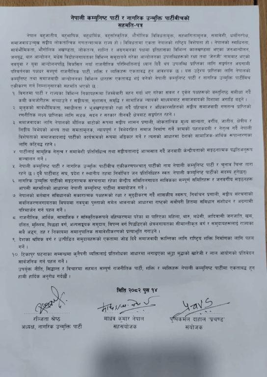 काठमाडौं । नेपाली कम्युनिष्ट पार्टी (नेकपा) र नागरिक उन्मुक्ति पार्टी (नाउपा) बिच एकीकरणको सहमति भएको छ ।