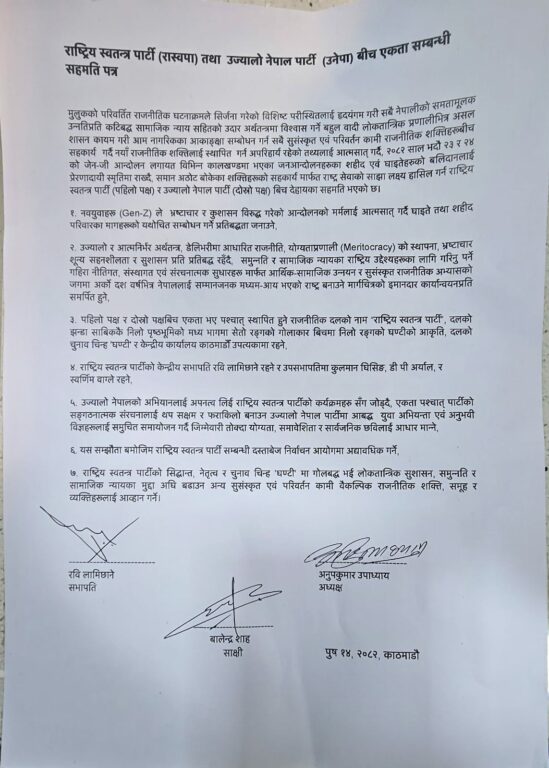 काठमाडौं । राष्ट्रिय स्वतन्त्र पार्टी र उज्यालो नेपाल पार्टीबिच ७ बुँदे सहमति भएको छ ।