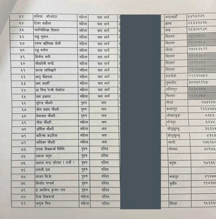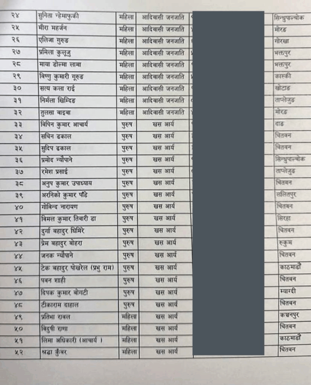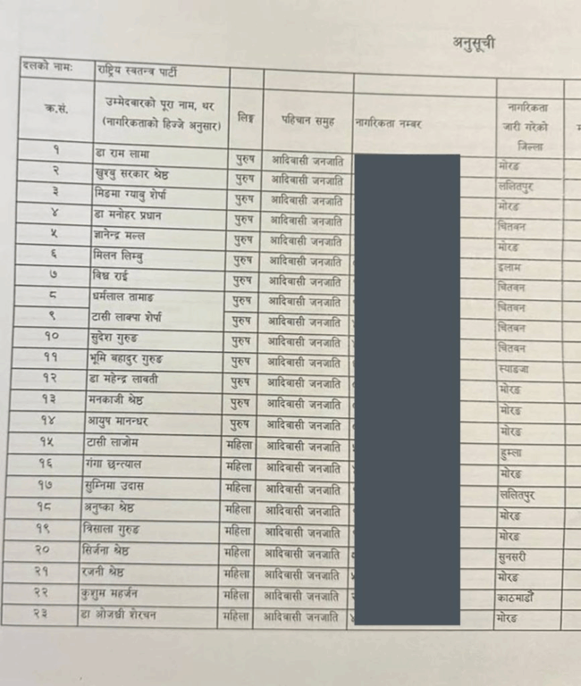रास्वपाका अनुसार समानुपातिक प्रणालीमार्फत विभिन्न समुदाय, पेसा र क्षेत्रका व्यक्तिहरूलाई प्रतिनिधित्व गराउन सूची तयार गरिएको हो ।