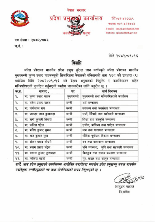काठमाडौैं । मधेश प्रदेश सरकारको मन्त्रिपरिषद् विस्तार भएको छ । नेपालको संविधानको धारा १६८ को उपधारा (९) बमोजिम मुख्यमन्त्री कृष्णप्रसाद यादवले चार दलबाट ६ जना मन्त्री नियुक्त गरेका हुन् ।