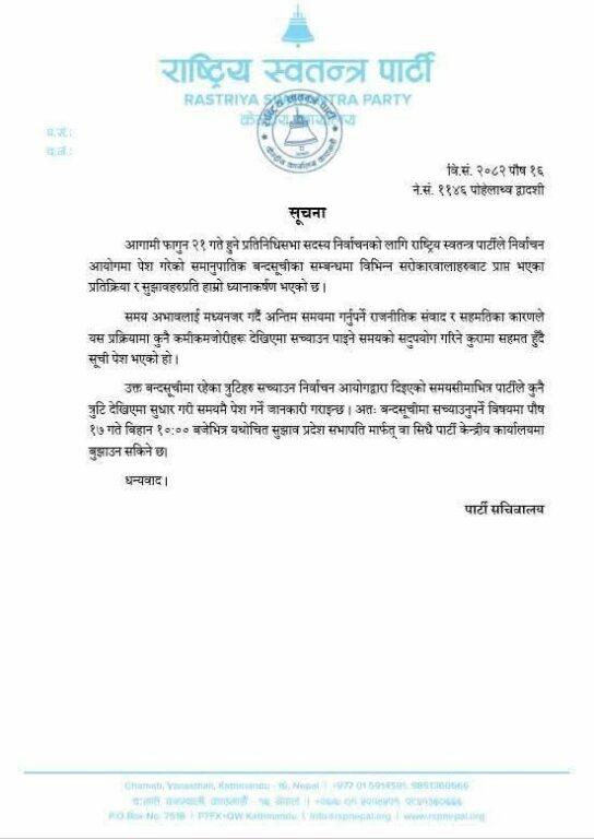 ‘उक्त बन्दसूचीमा रहेका त्रुटीहरु सच्याउन निर्वाचन आयोगद्वारा दिइएको समयसीमाभित्र पार्टीले कुनै त्रुटी देखिएमा सुधार गरी समयमै पेश गर्ने जानकारी गराइन्छ । अतः बन्दसूचीमा सच्याउनुपर्ने विषयमा पौष १७ गते बिहान १० बजेभित्र यथोचित सुझाव प्रदेश सभापति मार्फत् सित्रै पार्टी केन्द्रीय कार्यालयमा बुझाउन सकिने छ,’ विज्ञप्तिमा भनिएको छ ।