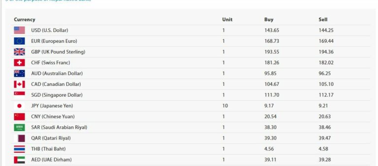 जापानी येन १० को खरिददर नौ रुपैयाँ १७ पैसा र बिक्रीदर नौ रुपैयाँ २१ पैसा, चिनियाँ युआन एकको खरिददर २० रुपैयाँ ५४ पैसा र बिक्रीदर २० रुपैयाँ ६३ पैसा, साउदी अरेबियन रियाल एकको खरिददर ३८ रुपैयाँ ३० पैसा र बिक्रीदर ३८ रुपैयाँ ४६ पैसा, कतारी रियाल एकको खरिददर ३९ रुपैयाँ ३० पैसा र बिक्रीदर ३९ रुपैयाँ ४७ पैसा कायम भएको छ ।