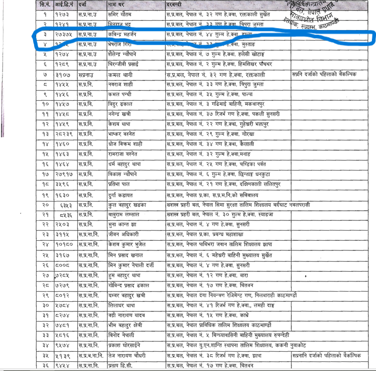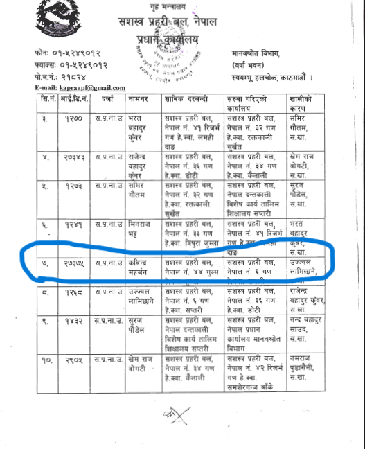 पुस १३ गते गरिएको सरुवा सूचीअनुसार, डीएसपी महर्जनलाई नम्बर ४४ गुल्म हे.क्वा. हुम्लाबाट नम्बर ६ गण हे.क्वा.सप्तरीमा पठाइएको छ । ४४ नम्बर गुल्म हुम्लामा भने मानवस्रोत विभागको दरबन्दीमा रहेर साढे ३ वर्षदेखि कर्मचारी प्रशासन शाखा हाँक्दै आएका डीएसपी नन्दबहादुर साउदलाई सरुवा गरिएको छ । त्यस दिन गरिएको ११ जना डीएसपीको सूची हेर्दा गुल्मको जिम्मेवारी पाउने एक मात्र ‘भाग्यमानी अधिकृत’ साउद बनेका छन् । साढे ३ वर्षदेखि कर्मचारी प्रशासन शाखाको जिम्मेवारीमा रहेका साउदको ‘व्यवस्थापन’ कै लागि डीएसपी महर्जनलाई यूएन मिसनमा पठाइएको सहजै बुझ्न सकिन्छ ।