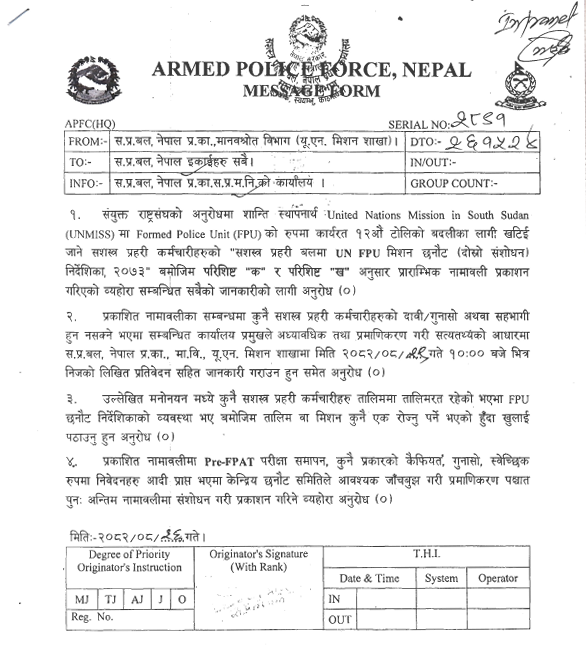 काठमाडौं । सशस्त्र प्रहरी बल प्रधान कार्यालयले गत मंसिर २६ गते संगठनबाट युनाइटेड नेसन्स मिसन इन साउथ सुडान (यूएन मिसन) मा आगामी बैशाखमा जाने आफ्ना कर्मचारीहरूको १ सय ७८ जनाको प्रारम्भिक सूची सार्वजनिक गर्दा त्यसमा ७ जना सशस्त्र प्रहरी नायव उपरीक्षक (डीएसपी) को पनि नाम उल्लेख छ ।